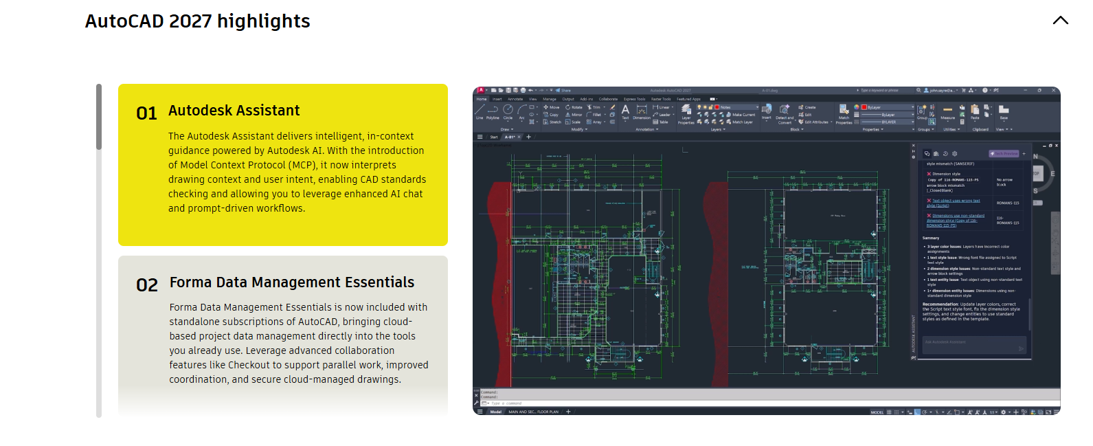 AutoCAD 2027 tiếp tục phát triển nền tảng AI đã có từ 2026 như Smart Blocks và Assistant, nhưng nâng lên cấp độ cao hơn: