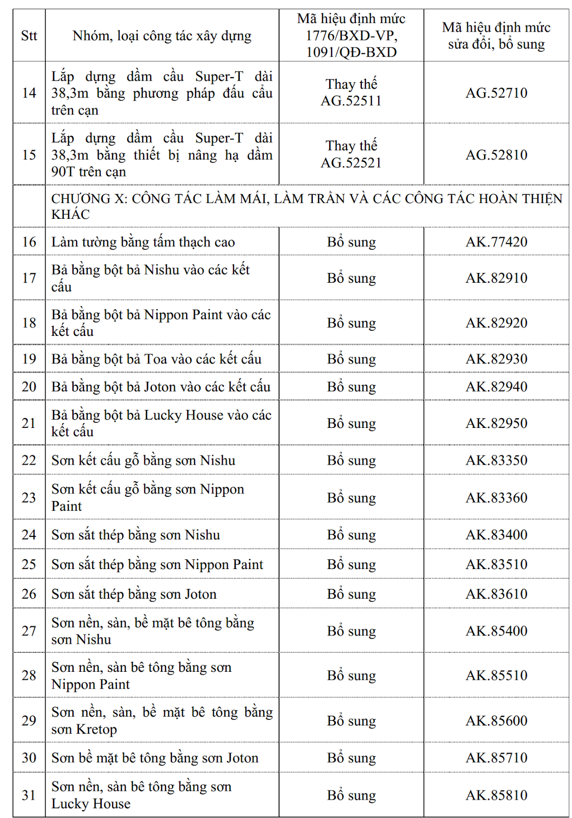 Tập định mức dự toán được trình bầy theo nhóm, loại công tác hoặc kết cấu xây dựng và được mã hóa thống nhất theo tập Định mức dự toán xây dựng công trình - Phần Xây dựng đã được công bố kèm theo văn bản số 1776/BXD-VP ngày 16/8/2007 của Bộ Xây dựng sửa đổi và bổ sung vào nội dung 6 chương.