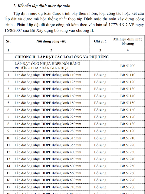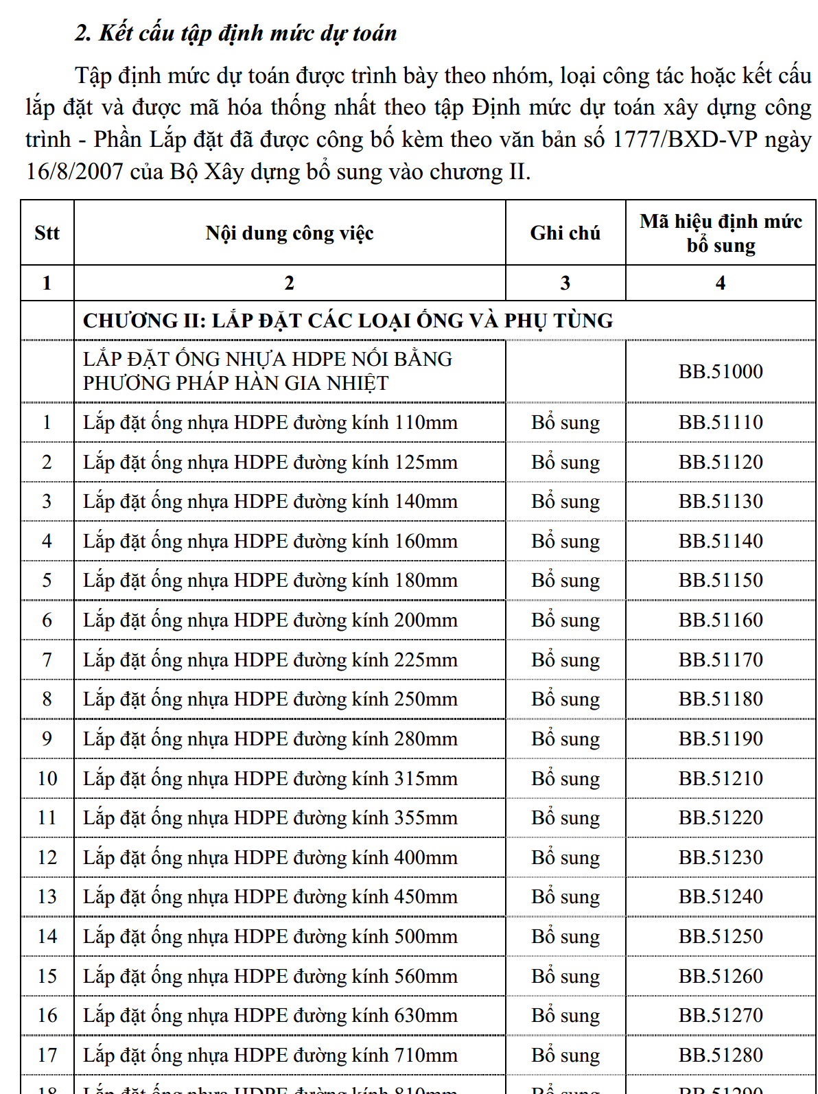 Tập định mức dự toán được trình bày theo nhóm, loại công tác hoặc kết cấu lắp đặt và được mã hóa thống nhất theo tập Định mức dự toán xây dựng công trình - Phần Lắp đặt đã được công bố kèm theo văn bản số 1777/BXD-VP ngày 16/8/2007 của Bộ Xây dựng bổ sung vào chương II.