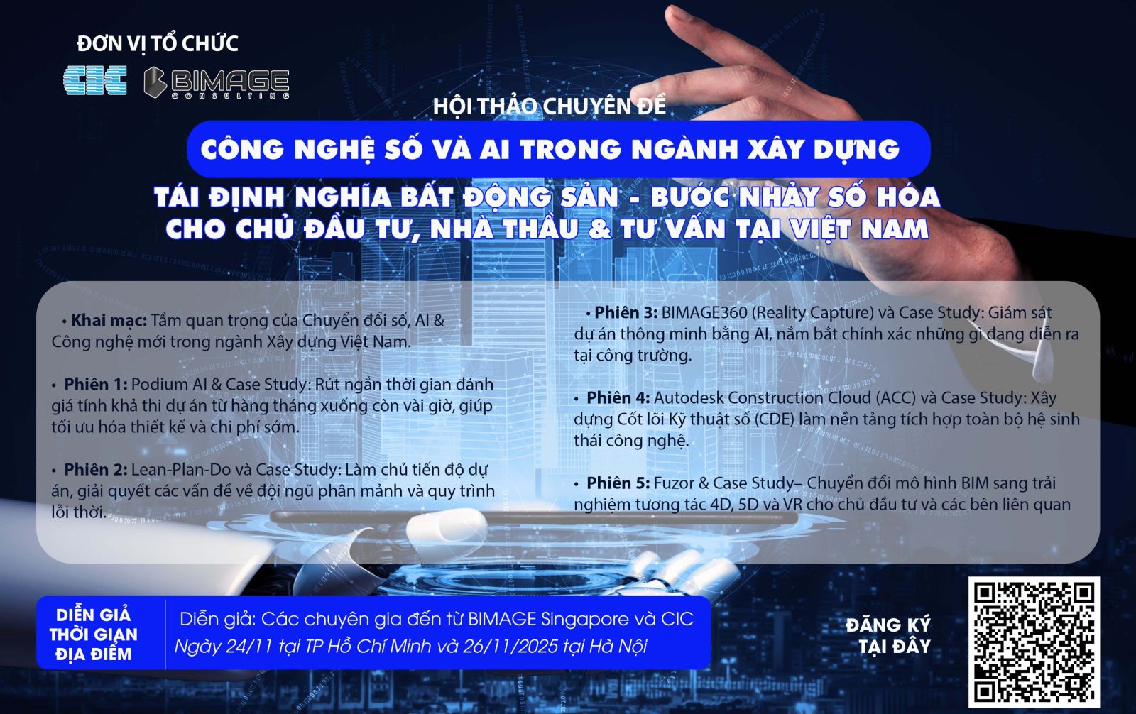 Nhằm đồng hành cùng doanh nghiệp trong hành trình đó, Công ty Cổ phần công nghệ và Tư vấn CIC phối hợp cùng Công ty BIMAGE Singapore tổ chức hội thảo chuyên đề “Công nghệ số và AI trong ngành Xây dựng - Tái định nghĩa Bất động sản: Bước nhảy số hóa cho các chủ đầu tư, nhà thầu và tư vấn tại Việt Nam”.