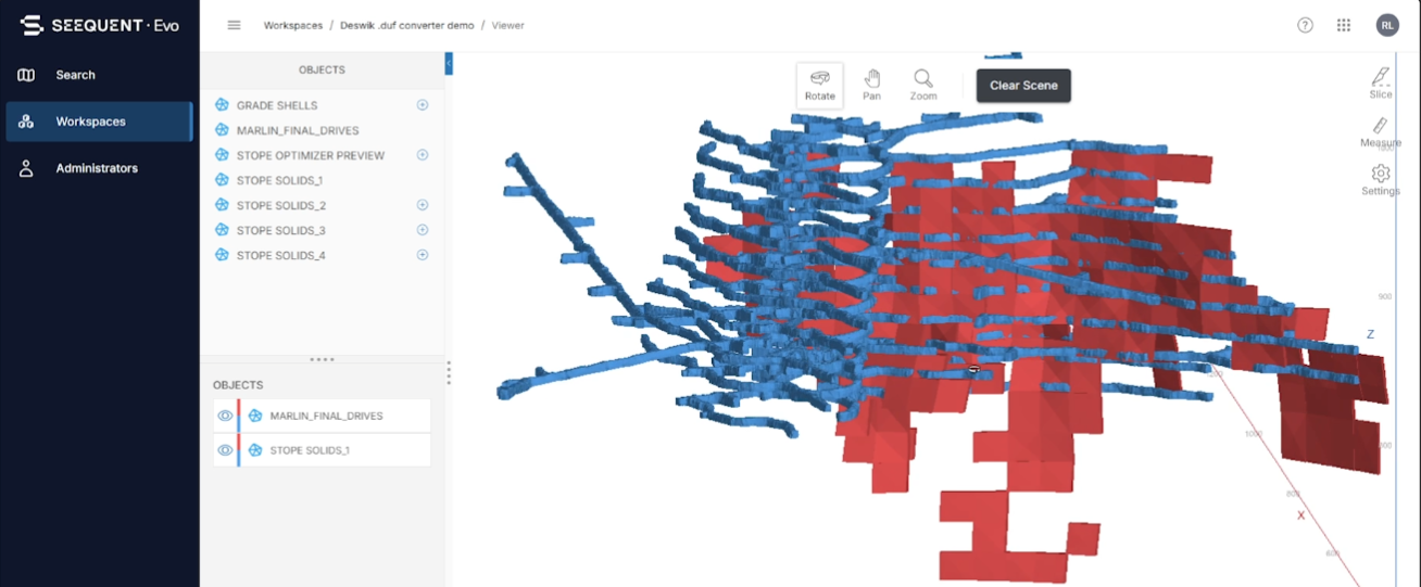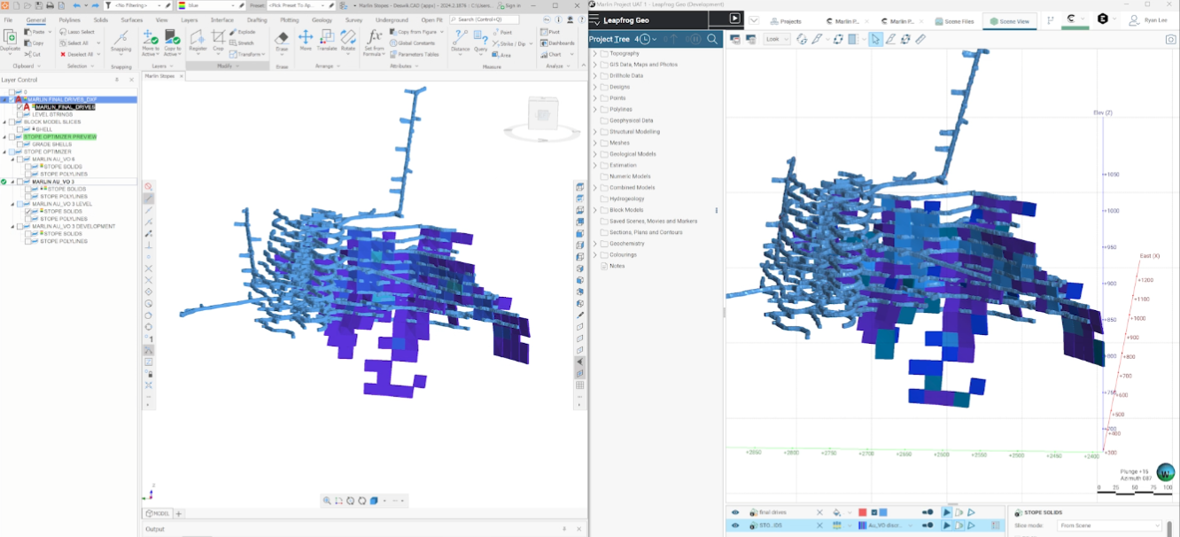Chuyển đổi dữ liệu thiết kế mỏ Deswik (bên trái) sang Leapfrog (bên phải) thông qua Evo mà không cần định dạng trung gian (Nguồn: Seequent)