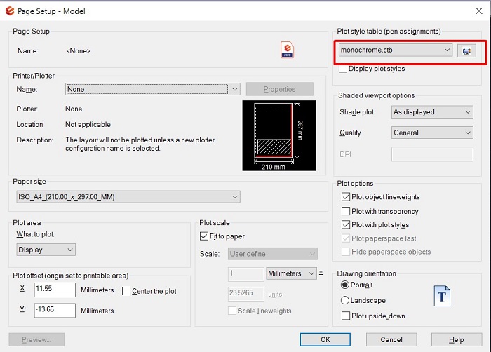 Bước 3: Ở hộp thoại page setup-model trong mục Plot style table => các bạn chọn monochrome.ctb => chế độ này in các nét theo màu đen trắng.
