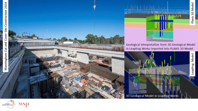 Hình ảnh mô tả tiến độ thi công hầm đào hở tại Manningham cùng với mô hình địa chất 3D Leapfrog Works và phân tích PLAXIS 3D
